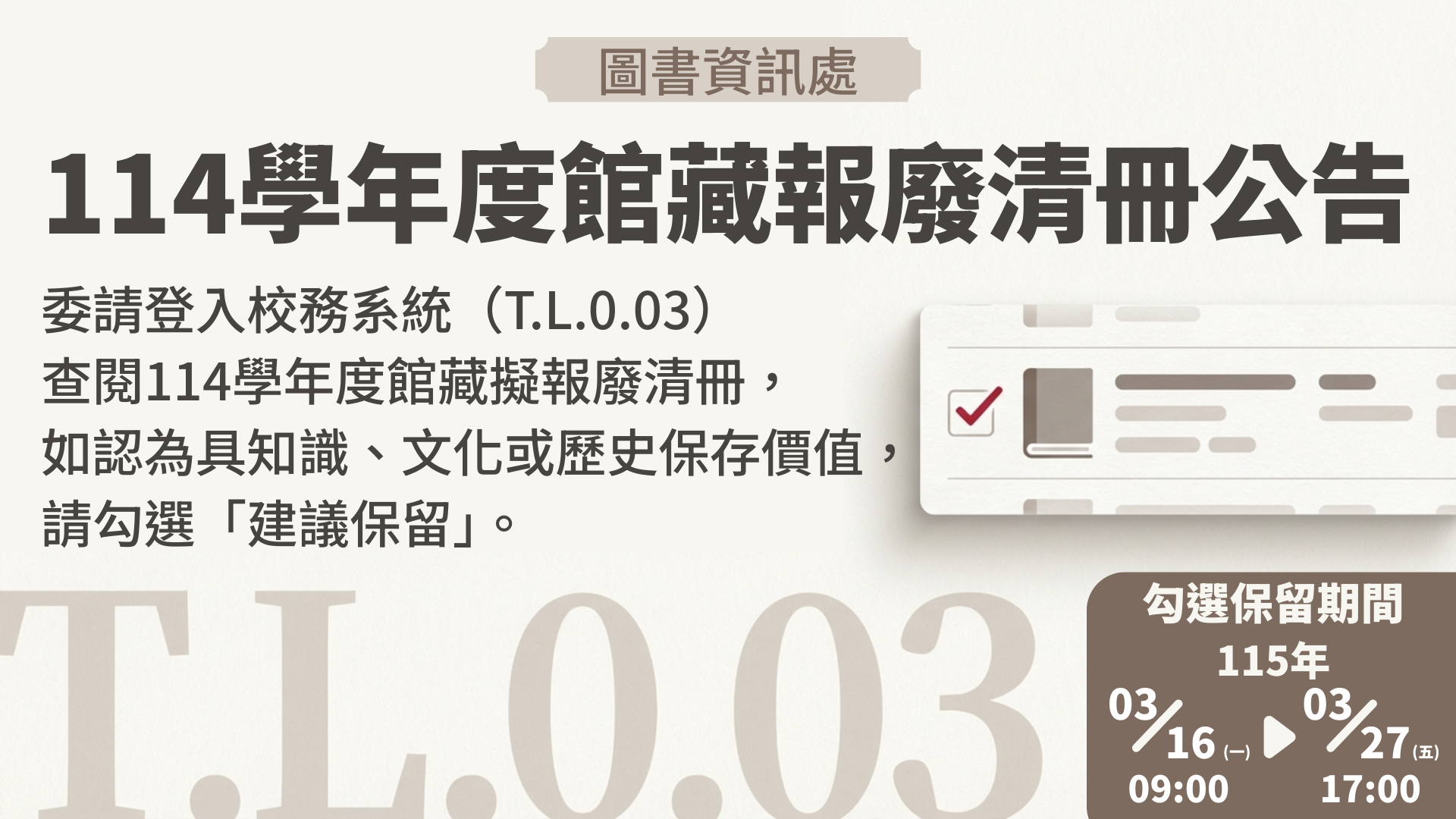 委請您登入校務系統(T.L.0.03) 館藏擬報廢清冊查閱,若您覺得有延續知識文化歷史價值的館藏,請勾選保留建議。感謝您撥冗費心協助!